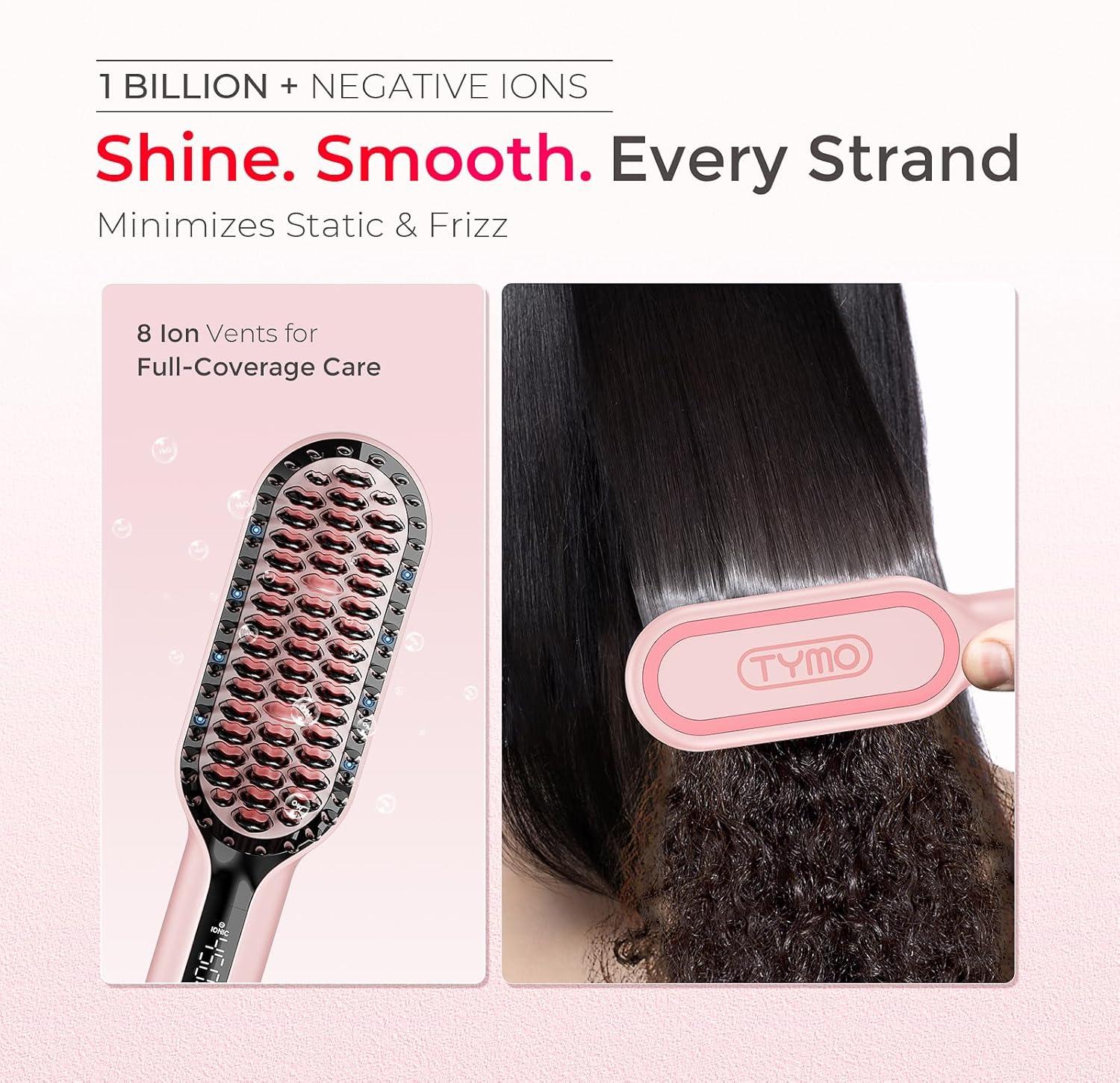 TYMO Hair Straightener Brush – Upgraded Ionic Compact Straightening Brush for Women with Wave-Design Bristles, Fast, Smooth Styling, Lightweight Hot Comb & Travel Flat Iron, 1 Billion Ions, Black(Pink)