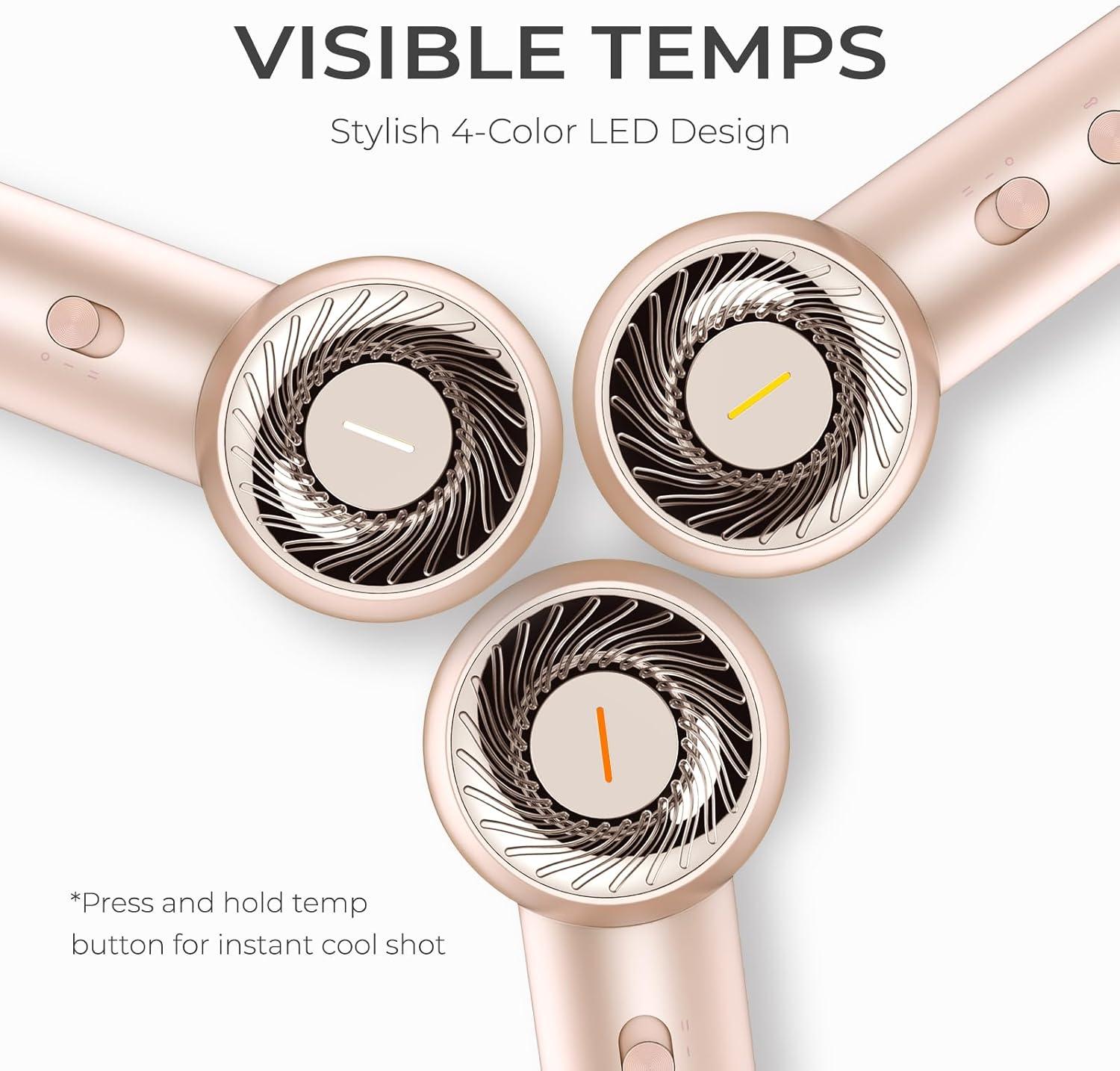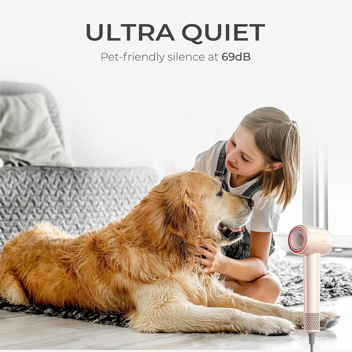 QUIET & PERSONALIZED: Ultra quiet at 69dB, our hair blow dryer ensures a pet-friendly low noise experience. With 2-speed options and 4 temperature settings that correspond to color-coded indicators, you can easily personalize your desired look!